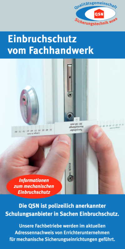 Als besonders qualifizierter Fachbetrieb gehören wir der QSN-Gemeinschaft an. Wir sind daher gemäß des bundesweiten Anforderungskataloges auf der aktuellen polizeilichen Empfehlungsliste von Errichterunternehmen für mechanische Sicherungseinrichten eingetragen.