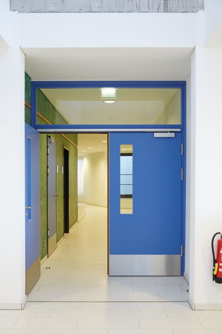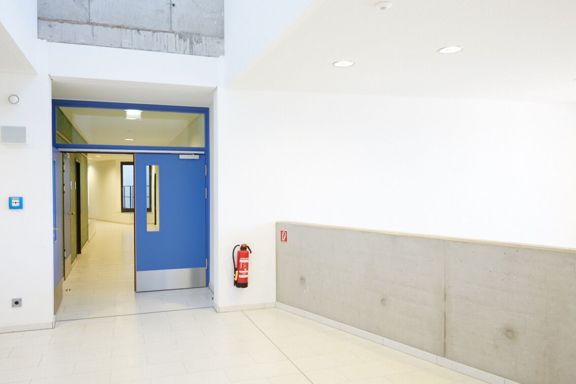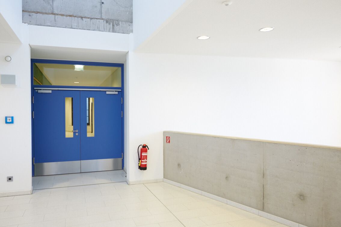 Der Innenbereich der Schule wurde komplett modernisiert. In diesem Zusammenhang wurde ebenfalls die Brandschutztüren als T 30-RS zweiflügelig mit Oberlicht und Feststellanlage erneuert.