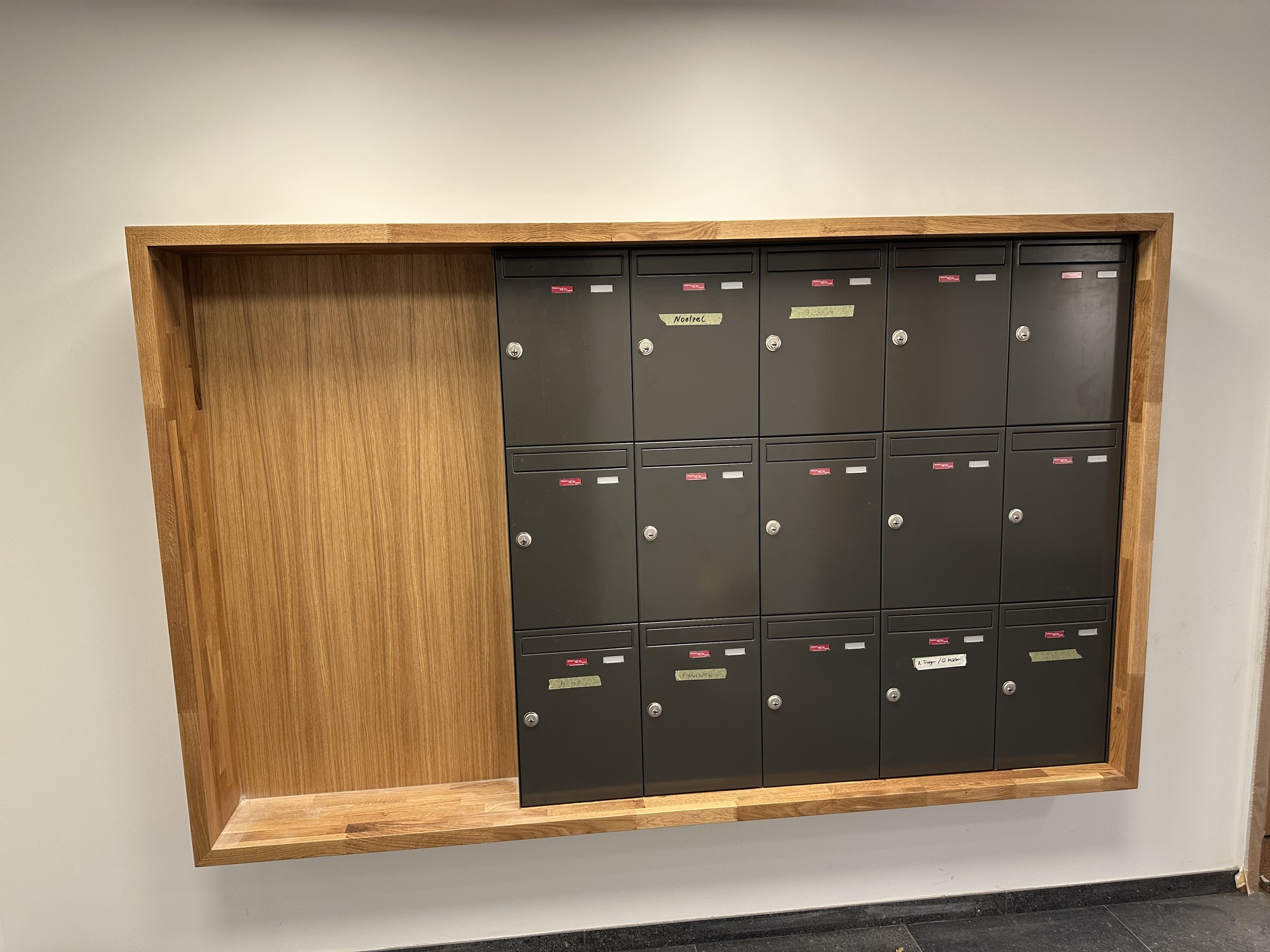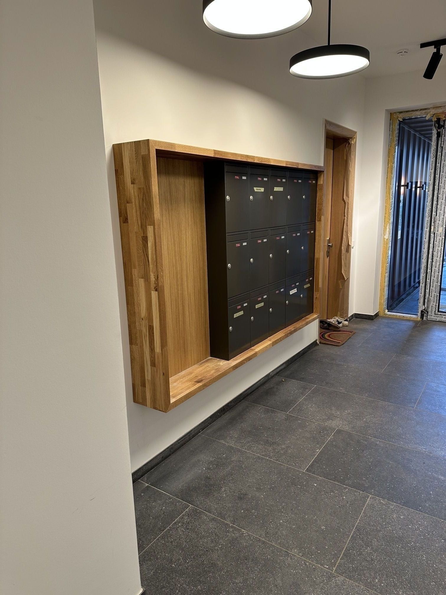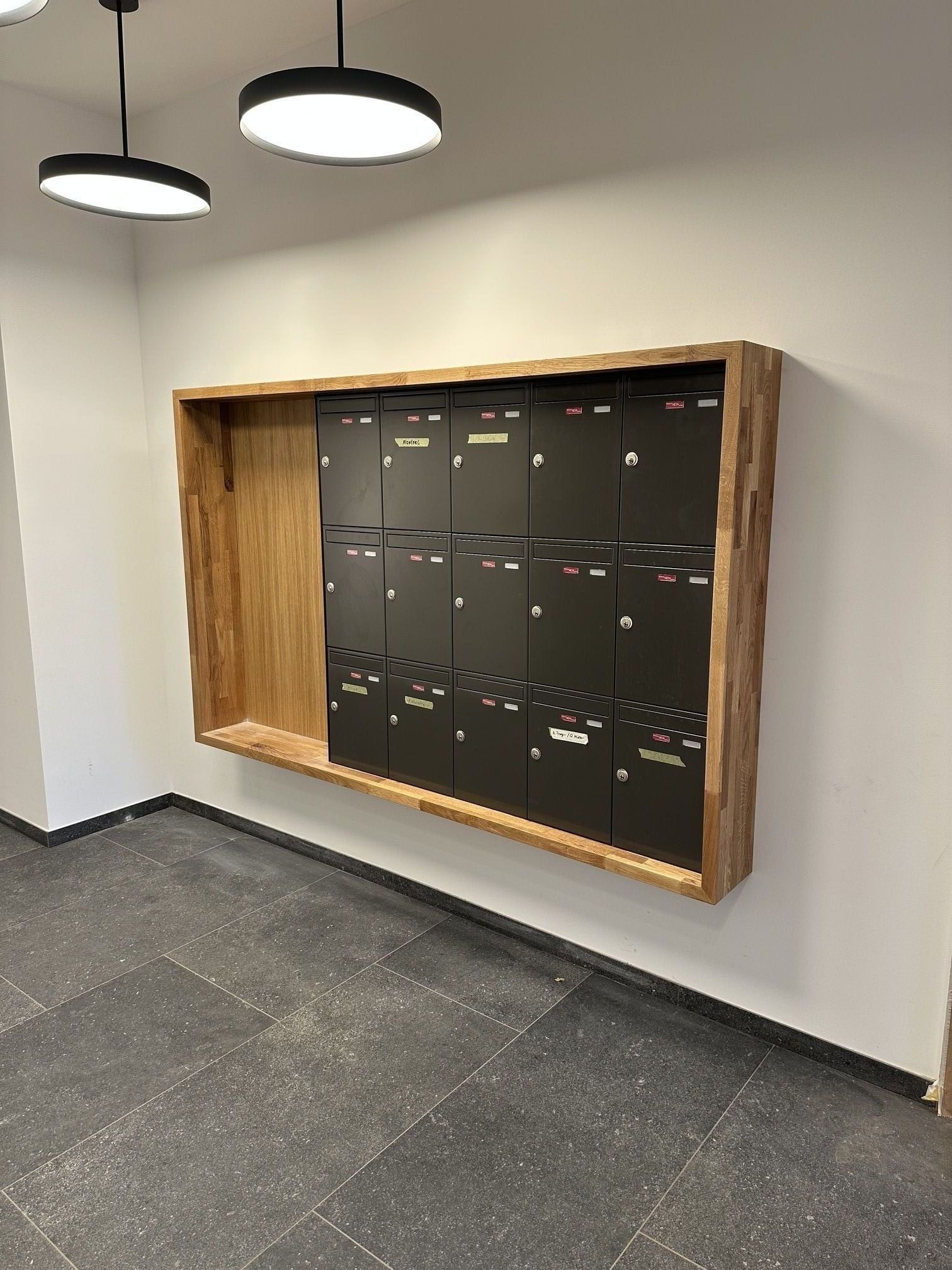 Für die Mieter eines Mehrfamilienhauses wurde um die Briefkastenanlage eine Umrandung im Flur des Hauses herstellen. Diese Umrandung wurde aus Eiche massivholz hergestellt und direkt um die Briefkastenanlage unsichtbar befestigt montiert.