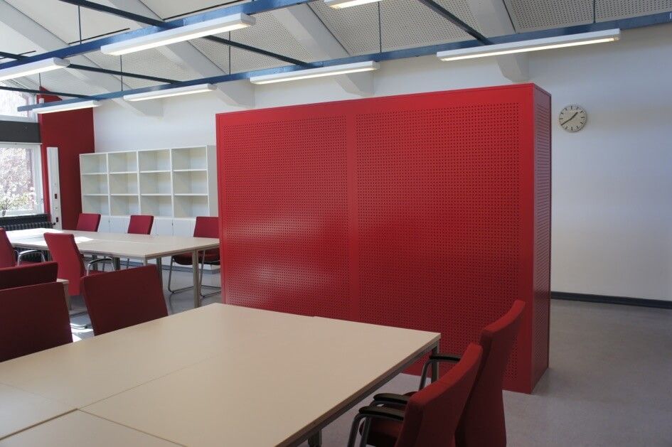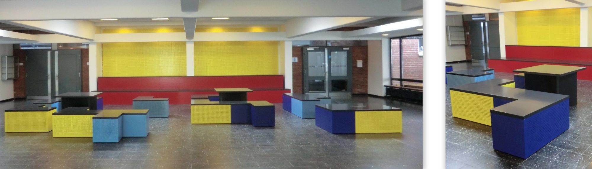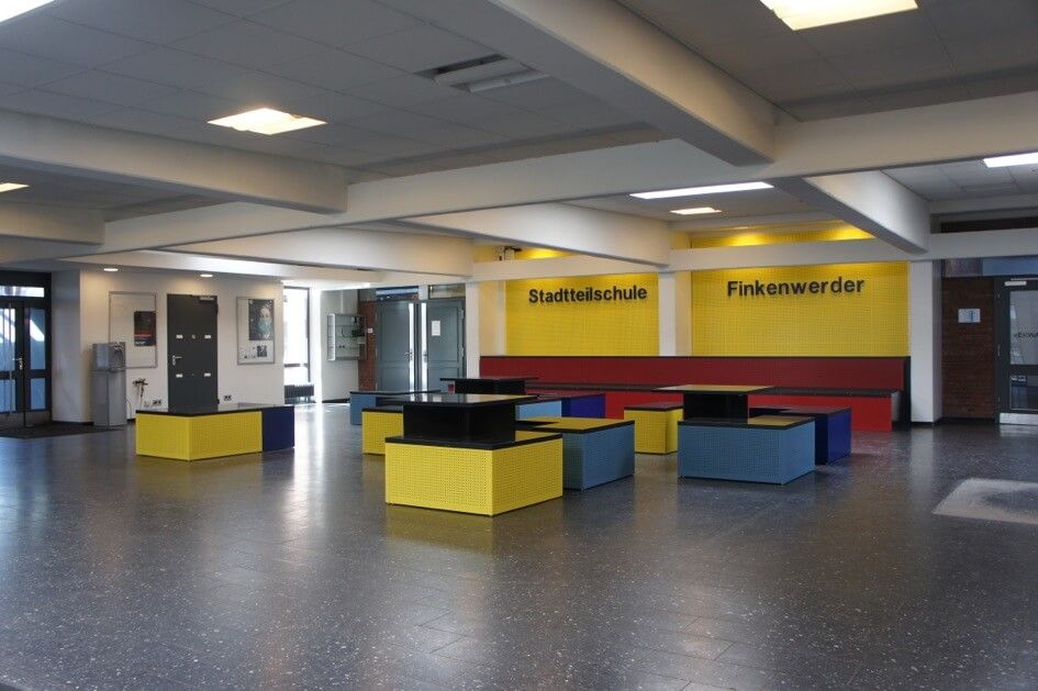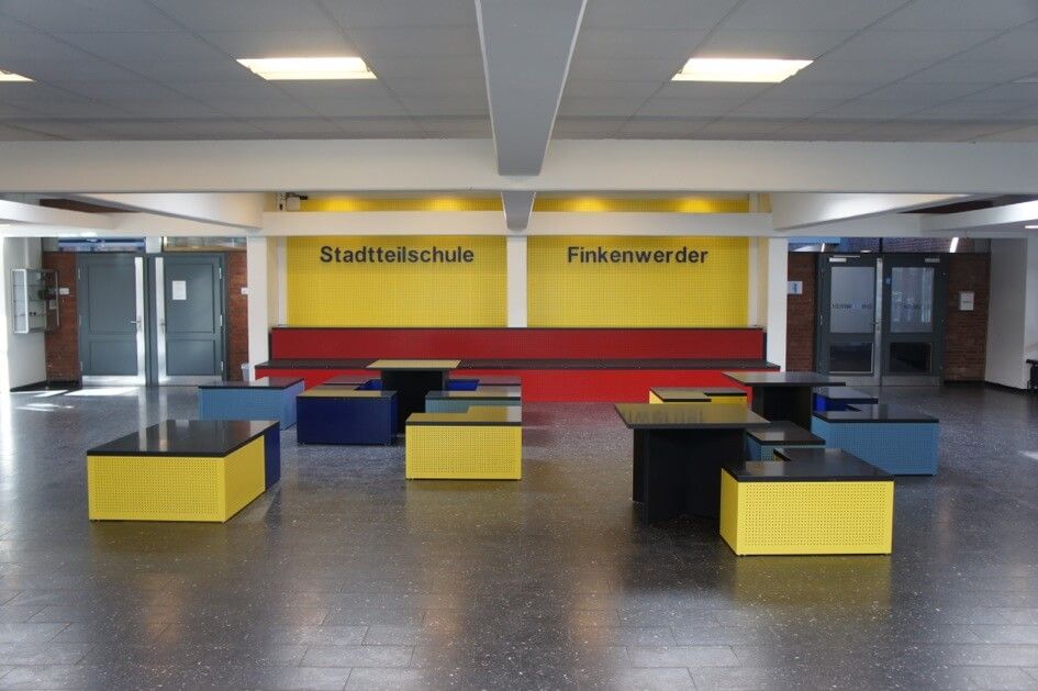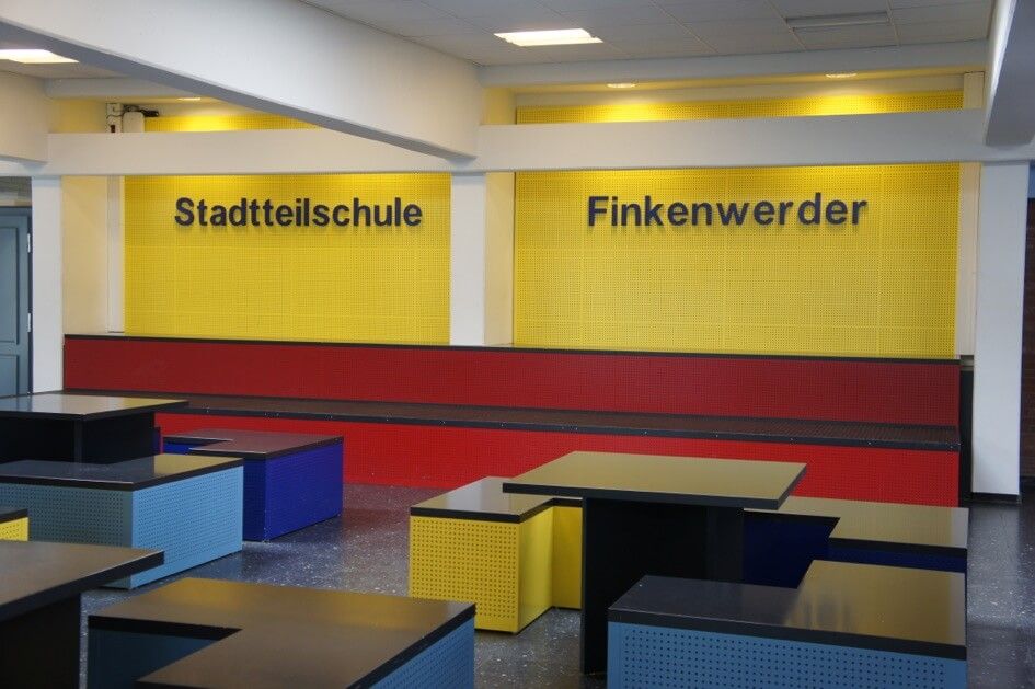 Angefertigt wurden in verschiedenen Farben lackierte und mit einem Lochmuster versehene Sitzmöbel, dazu passende Tische, eine neue Wandverkleidung mit demselben Lochmuster sowie ein Schriftzug „Stadtteilschule Finkenwerder“ für die neugestaltete Wandverkleidung.