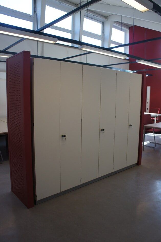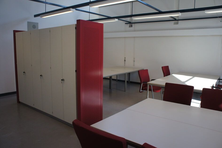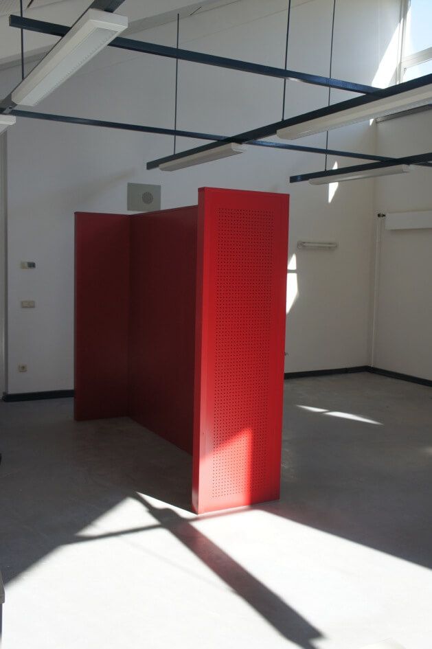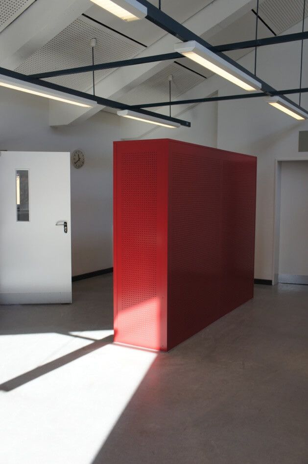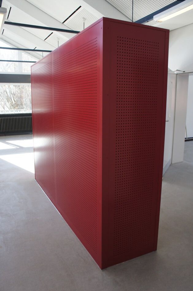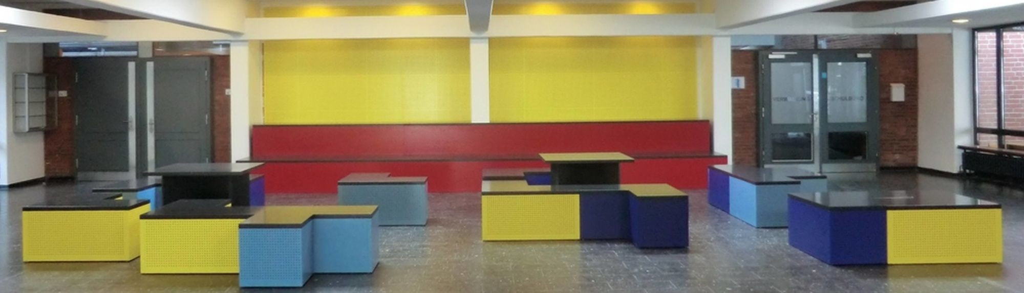 Angefertigt wurden in verschiedenen Farben lackierte und mit einem Lochmuster versehene Sitzmöbel, dazu passende Tische, eine neue Wandverkleidung mit demselben Lochmuster sowie ein Schriftzug „Stadtteilschule Finkenwerder“ für die neugestaltete Wandverkleidung.