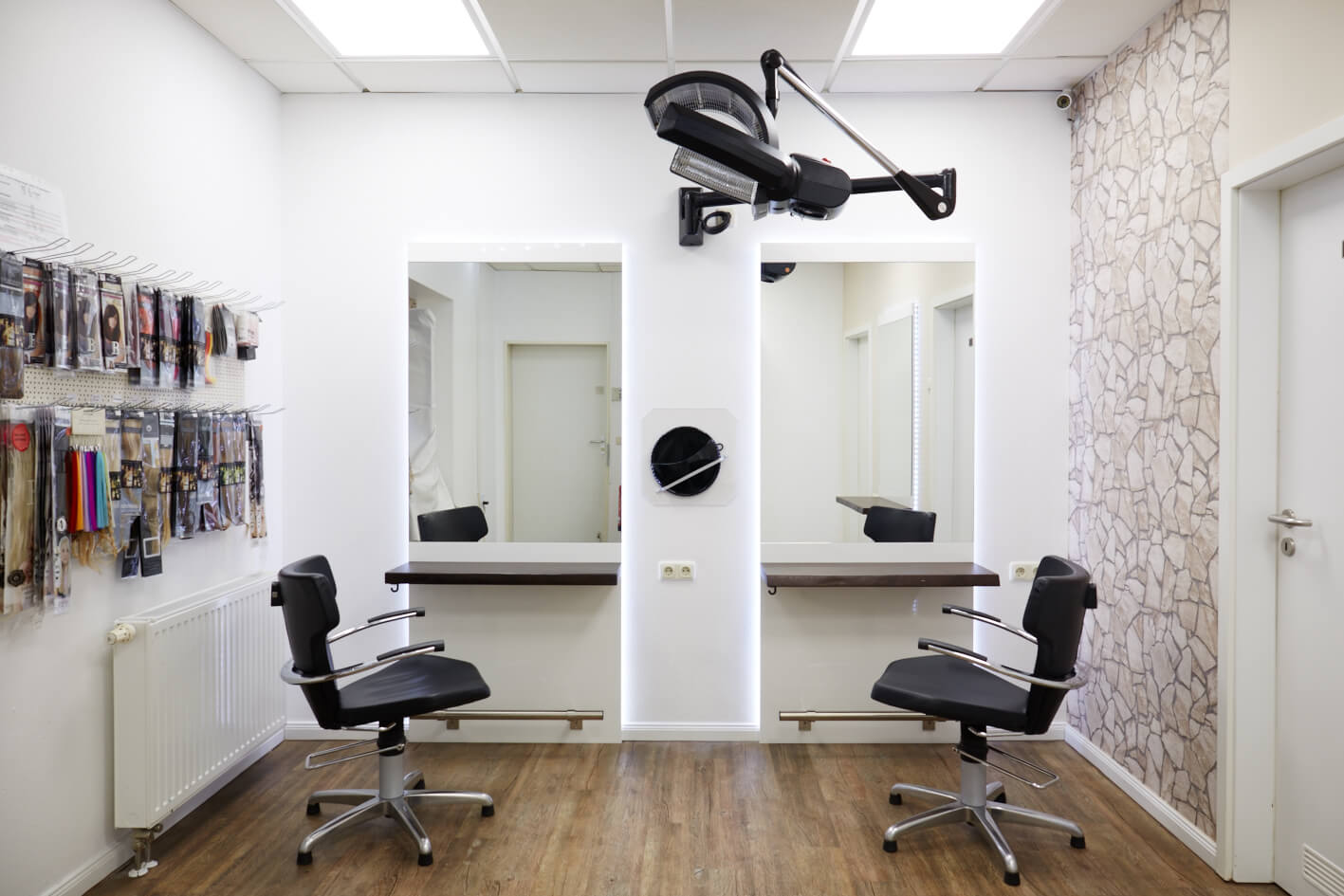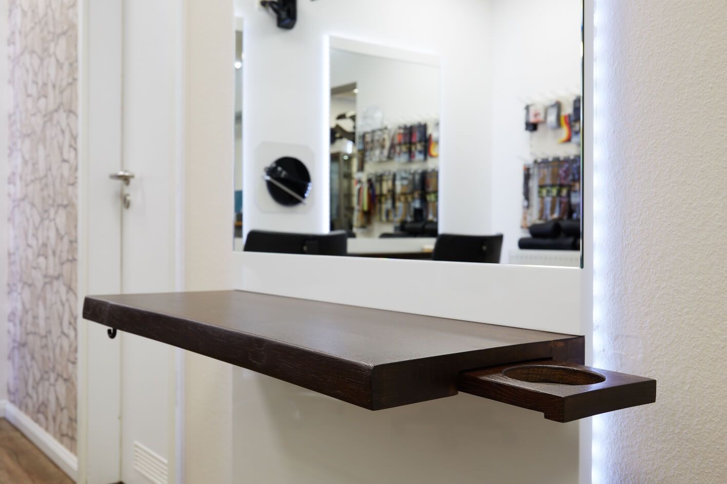 Ein Friseur hat von uns 10 Frisierständer als Möbel mit Spiegel geliefert und montiert bekommen. Die Besonderheit ist die Grundkonstruktion. Hinter einer weißen Grundplatte erstrahlt die Wand durch die LED-Beleuchtung. Vorne ist ein Spiegel und eine Ablage zu sehen. In der Ablage gibt es die Möglichkeit einen Föhn einzuhängen.