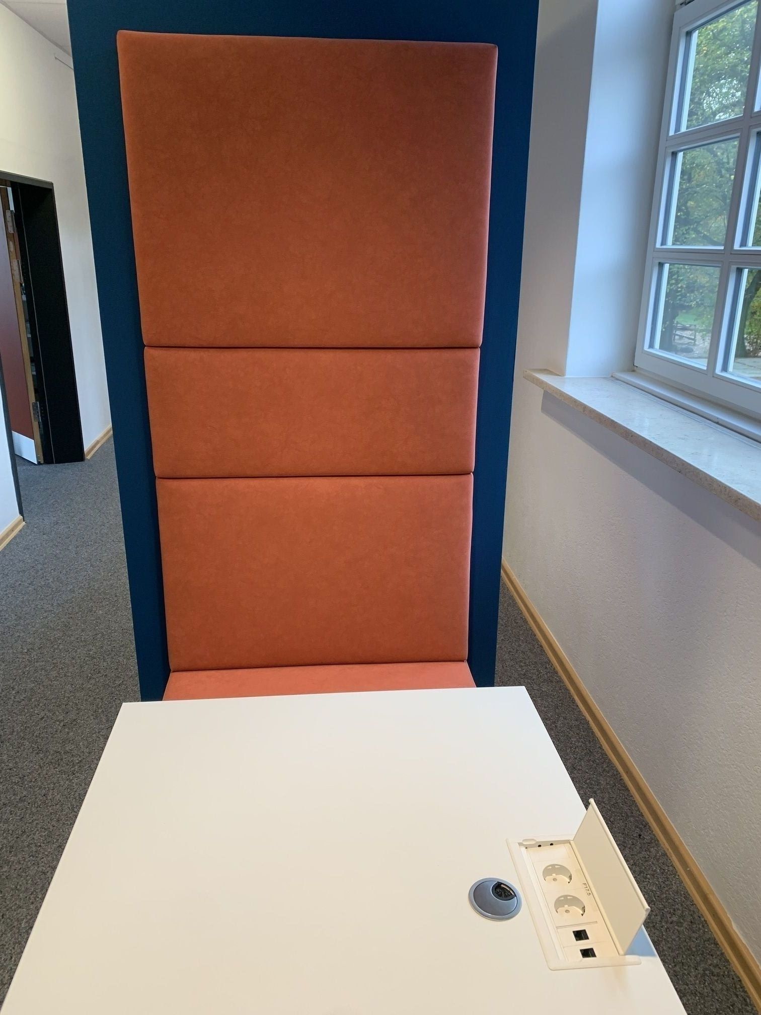 Durch das Tischbein wurden die Elektronischen Anschlüsse in die Platte eingearbeitet. Mittels eines Klappdeckels kommt man an die Steckdosen heran. Dabei war es wichtig, dass keine weiteren Kabel irgendwo zu sehen sind, sondern dass diese verschwunden in der Tischplatte und dem Tischbein verschwunden sind.