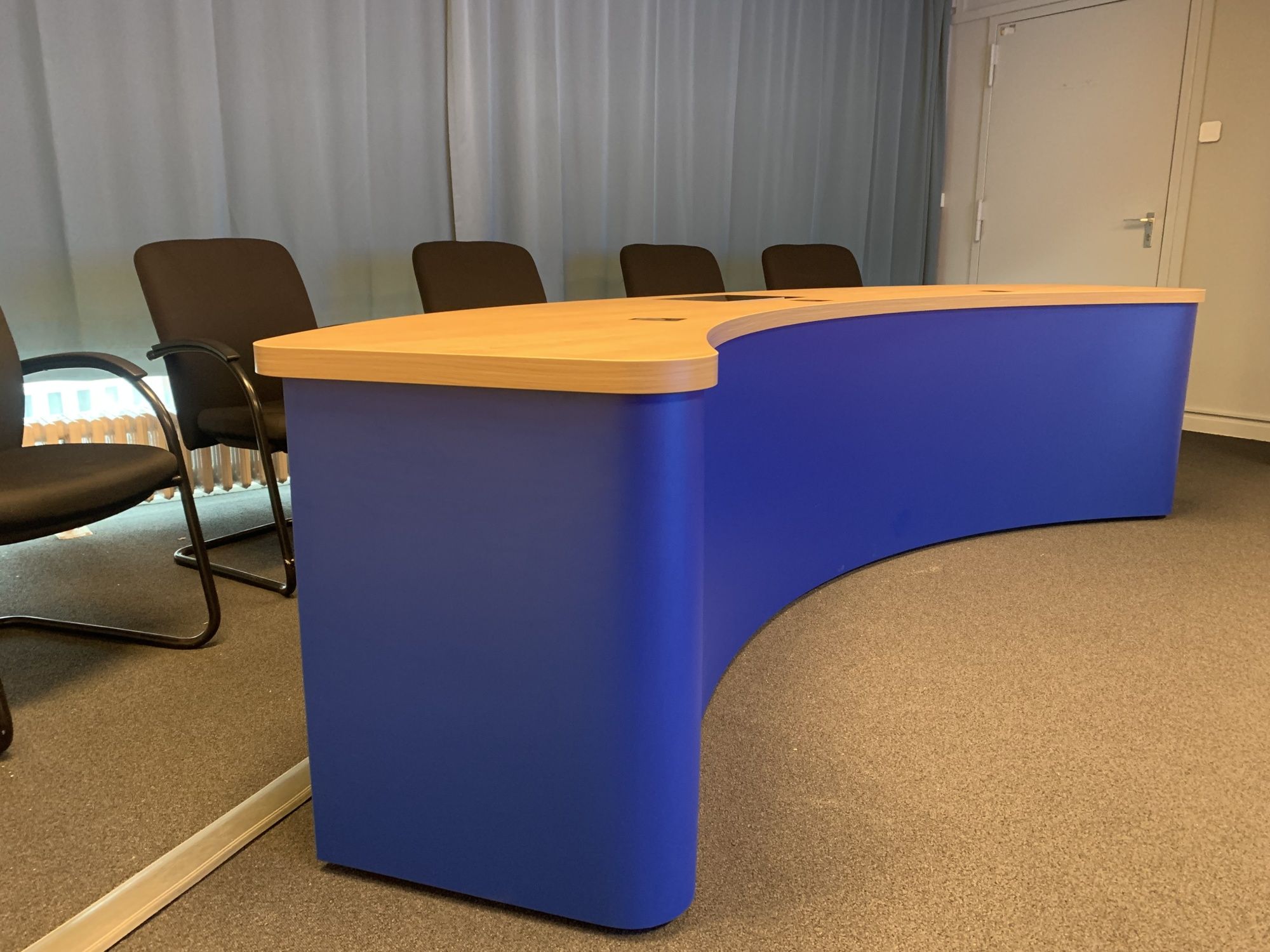 Herstellung eines geschwungenen Medientisches mit einer Kirschholz beschichteten Platte und einer dunkelblauen rund gebogenen Frontplatte. Der Tisch ist rollbar und kann aber auch festgestellt werden. Versteckte Lautsprecher und versteckt liegende Ablage für ein Tablet führen dazu, dass Kabel und Zuleitung unterhalb vom Tisch (hinter der Frontplatte) verlaufen und somit für den Betrachter nicht zu sehen sind.