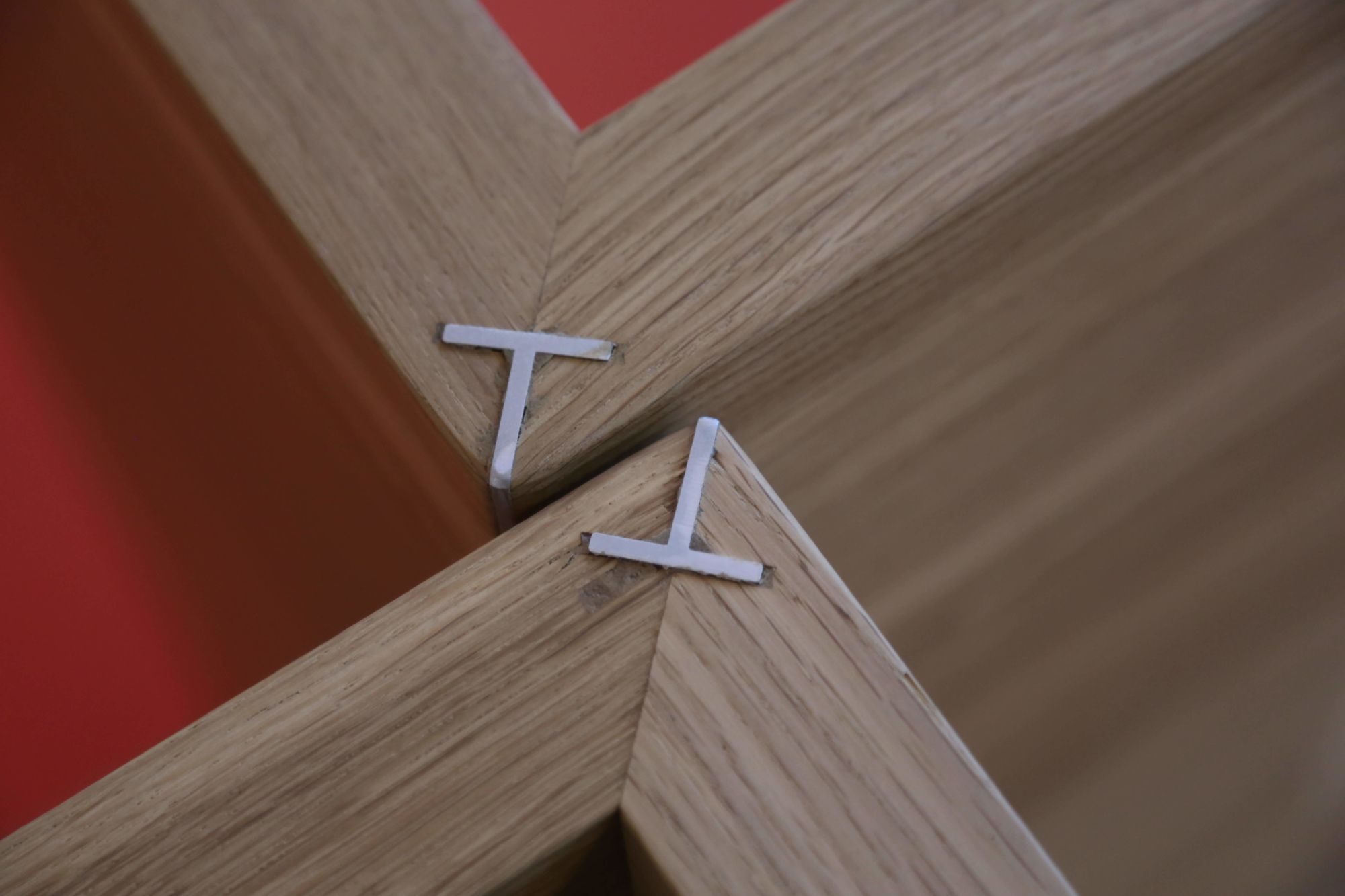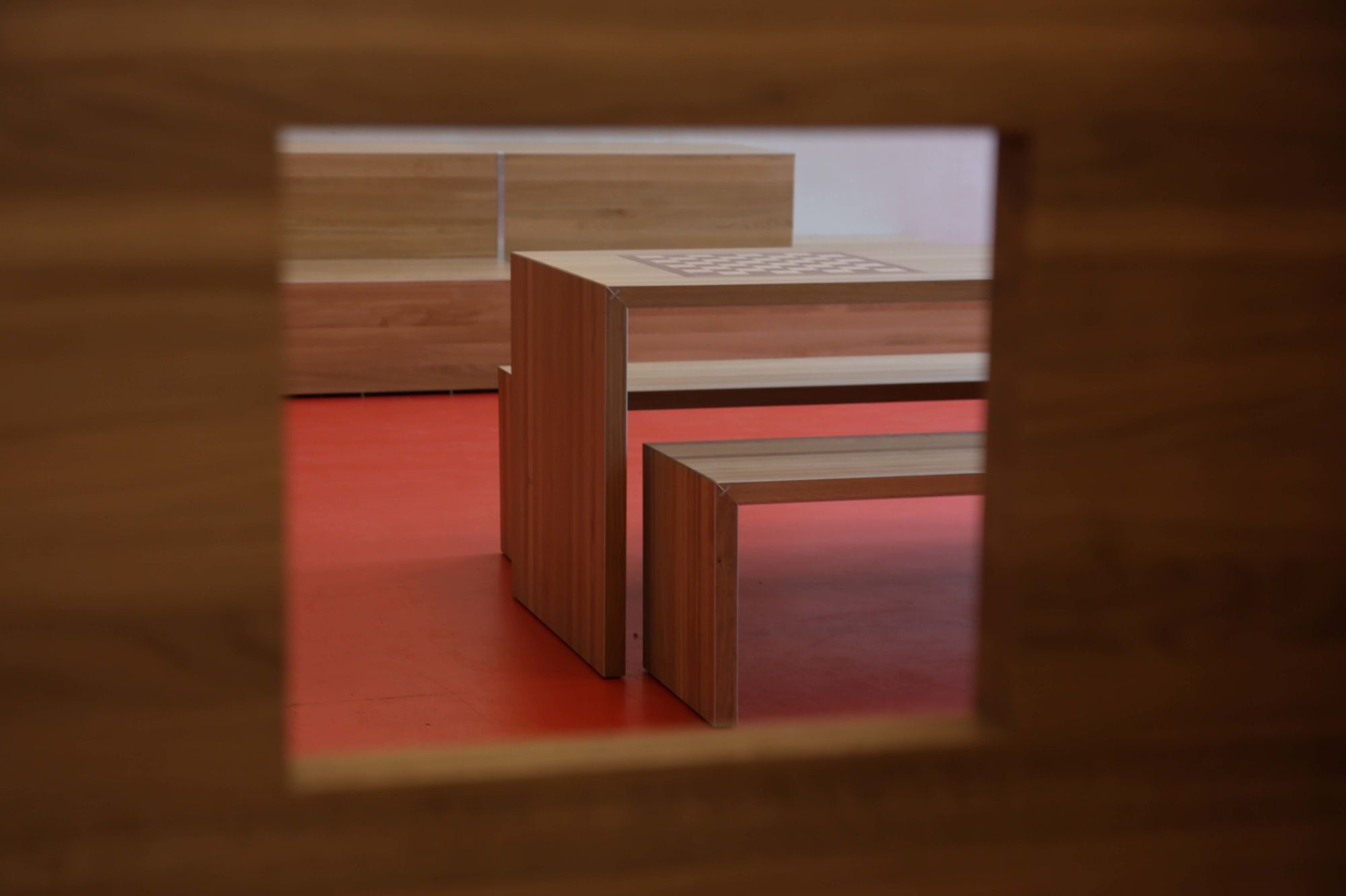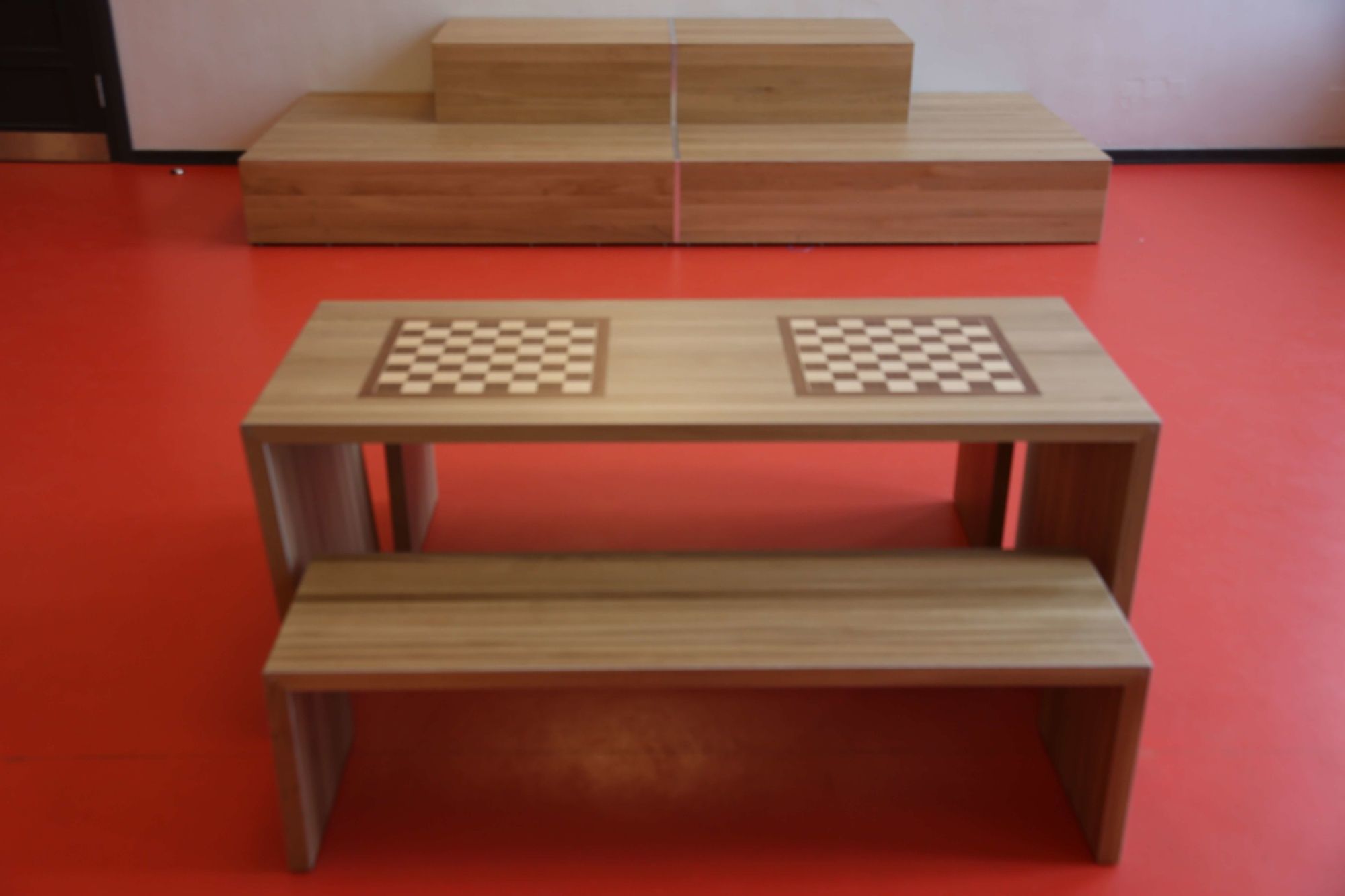Für vielfältige Nutzungsmöglichkeiten wurden die Raumteiler auch als Sitzmöglichkeit konzipiert, die Tische erhielten flächenbündige Schachbretter und wurden ebenso wie die Bänke mit Alustäben an den Kanten verstärkt.