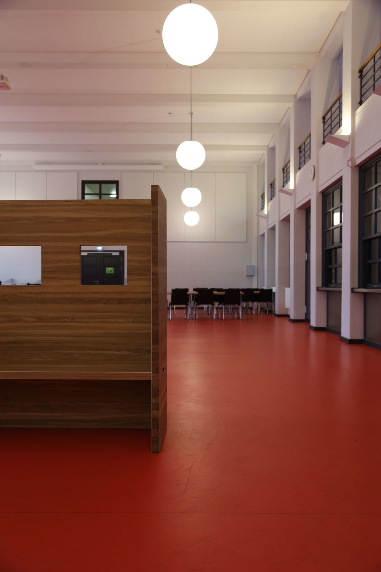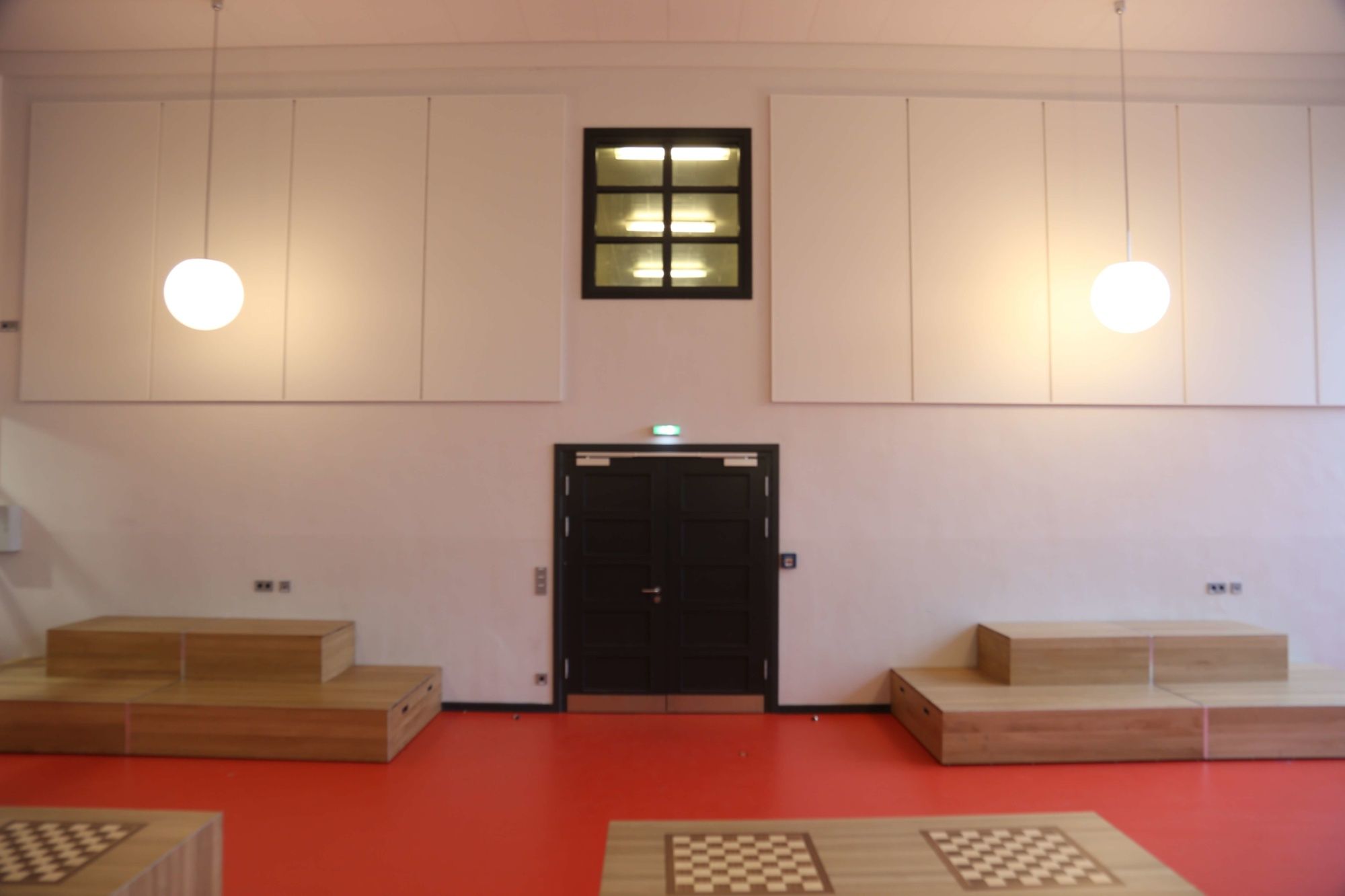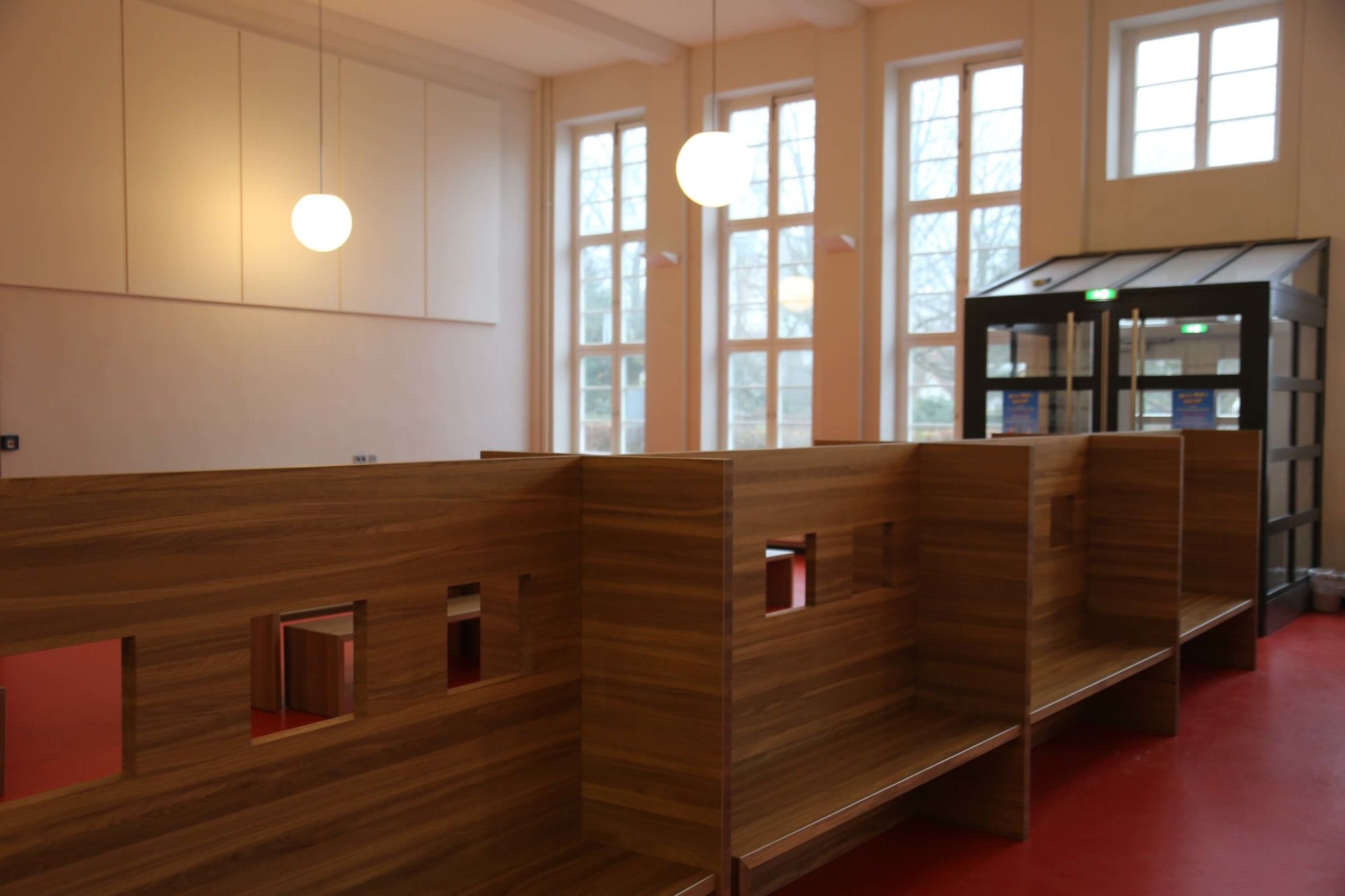 Im Zuge des Umbaus dieser Schule wurde der Eingangsbereich umgestaltet in eine Mensa. Dafür wurden neue Sitzmöglichkeiten, Tische und Raumteiler aus Holz bestellt.