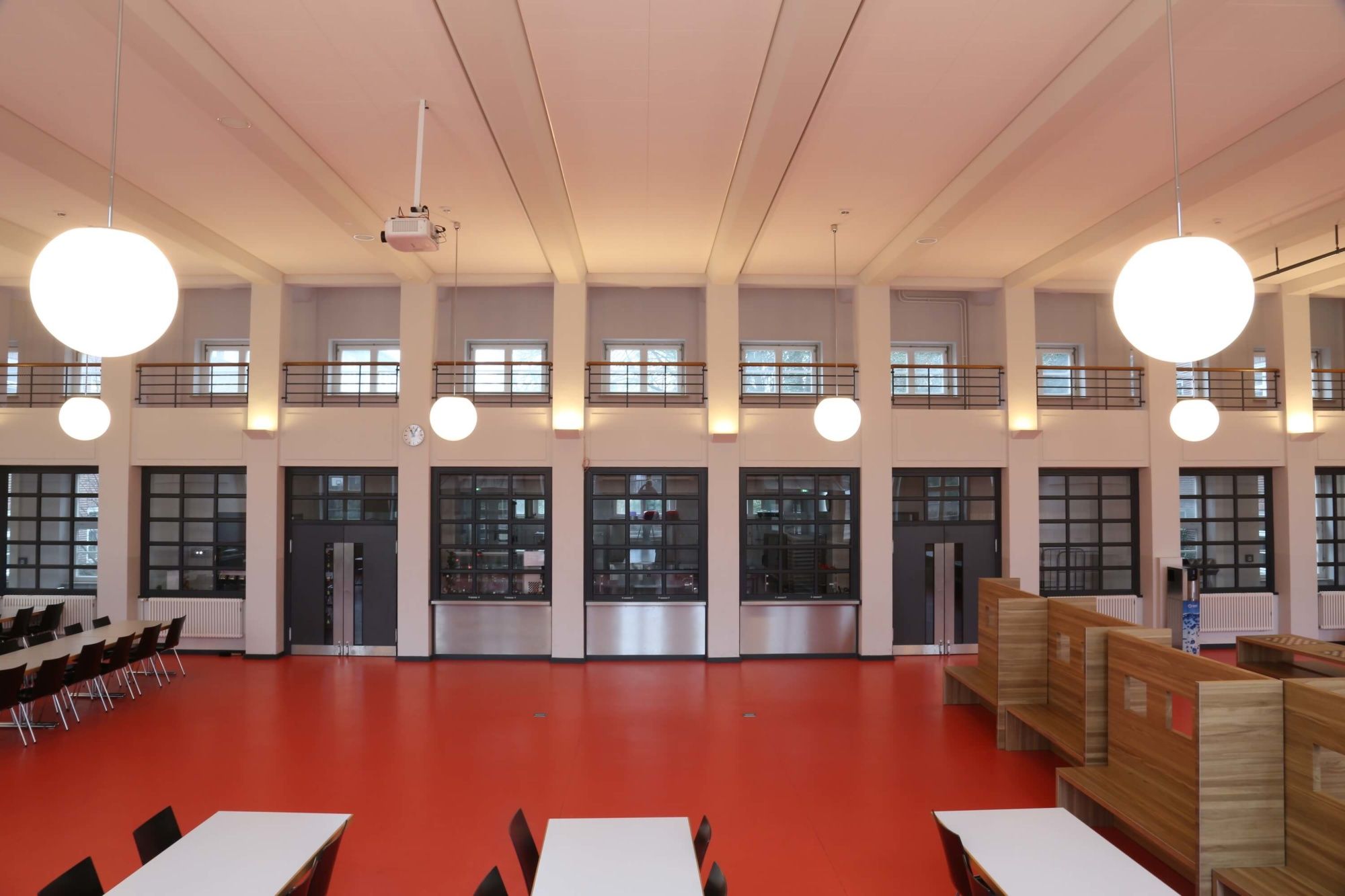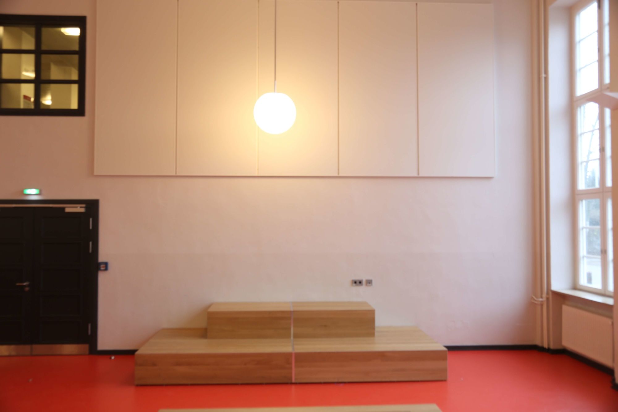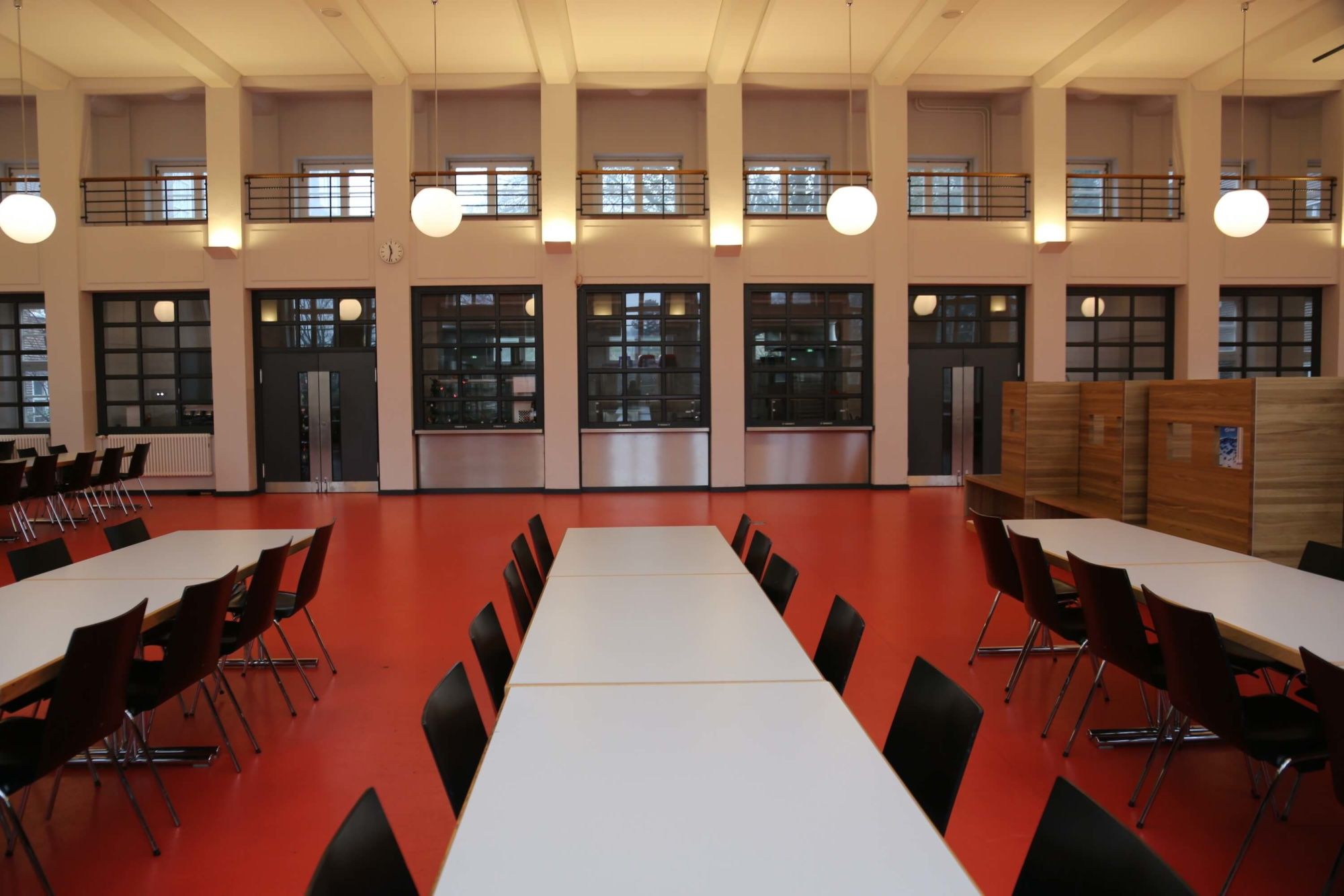 Im Zuge des Umbaus dieser Schule wurde der Eingangsbereich umgestaltet in eine Mensa. Dafür wurden neue Sitzmöglichkeiten, Tische und Raumteiler aus Holz bestellt.